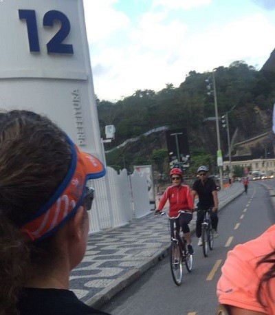 A ciclista desocupada ressurge no Rio exibindo o vermelho-PT no casaco e no capacete