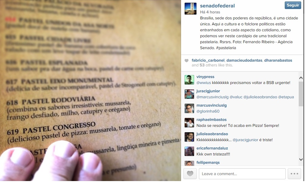 O perfil oficial do Senado Federal do Instagram fez ontem um auto-bullying. Uma foto postada fez piada com o cardápio de uma pastelaria de Brasília, que oferece o pastel sabor Congresso, com recheio de… pizza.