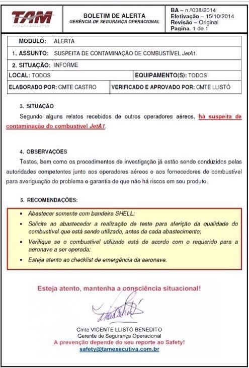 (Atualização, às 19h59. A assessoria da TAM envia o seguinte esclarecimento: “A TAM Aviação Executiva emite rotineiramente para seus pilotos, através de seus canais de comunicação interna, boletins contendo informações a respeito dos insumos utilizados em suas aeronaves. Esses procedimentos fazem parte da rígida política de segurança na operação de suas aeronaves”)