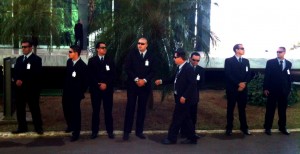 No ponto de desembarque há cerca de 50 seguranças, todos de terno, gravata e óculos escuros, acompanhando a chegada de advogados, ministros e imprensa.