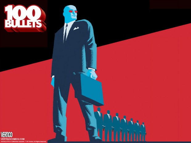 Publicada entre 1999 e 2009, pela Vertigo, que pertence à DC Comics, a HQ teve um total de 100 edições. Com uma estética noir e seguindo a ideia de que todos no mundo estão, de alguma forma, conectados, a história de “‘100 Bullets” acompanha o misterioso Agente Graves, que tem como objetivo destruir uma sociedade clandestina conhecida como The Trust, que controla várias áreas do mercado financeiro mundial. Para tanto, ele oferece às pessoas que sofreram algum mal, a oportunidade de matar o responsável sem sofrer as conseqüências legais.