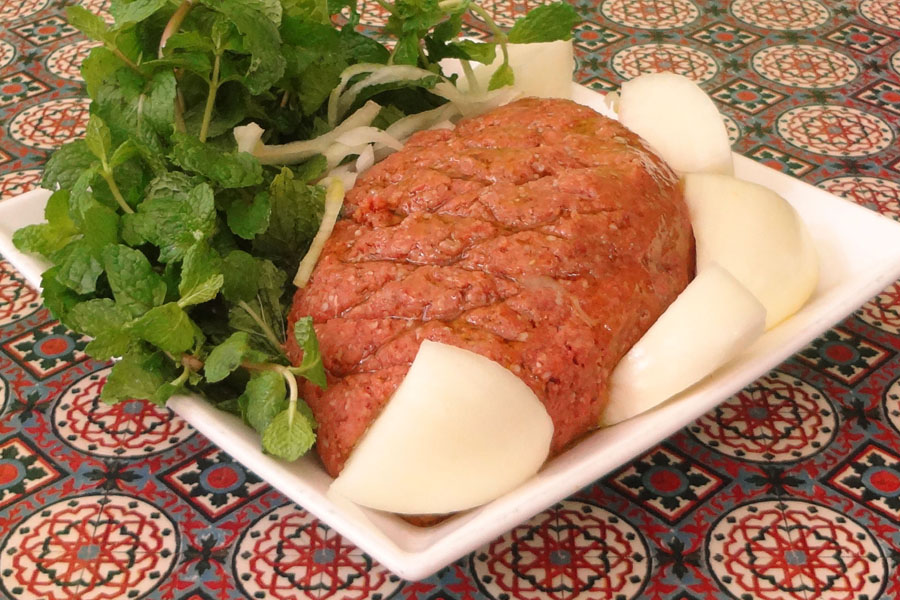 - Entrada: Hummus bi tahine e babaganuj, kibe neie (cru), makdous (miniberinjelas recheadas com nozes picantes)