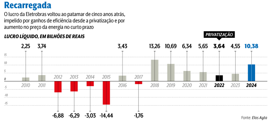 Eletrobras, a maior empresa de geração e transmissão de energia elétrica da América Latina, provou em apenas dois anos que, livre de ingerência política direta e com foco em eficiência, é capaz de obter bons resultados sem prejuízo para a prestação dos serviços. Desde que foi privatizada, em 2022, por iniciativa do Congresso Nacional no governo Jair Bolsonaro, a companhia arrumou a casa e anunciou um crescimento robusto de 136% no lucro líquido em 2024, alcançando quase 10,4 bilhões de reais. Diante de um resultado tão consistente, a companhia decidiu fazer a maior distribuição de dividendos aos acionistas de sua história: 4 bilhões de reais, a serem entregues a partir de maio deste ano. “O lucro registrado já é reflexo de medidas como redução de pessoal, venda de ativos e perspectiva de pagamento de dividendos. Agora é observar a velocidade dessas medidas, mas a tendência é positiva, apesar de o preço da ação ainda não refletir isso totalmente”, diz Vitor Sousa, analista da corretora Genial Investimentos.