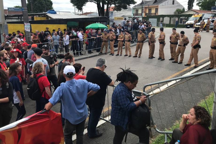 Um grupo de manifestantes se aglomera em frente à sede da Polícia Federal em Curitiba. O local está cercado por policiais militares.