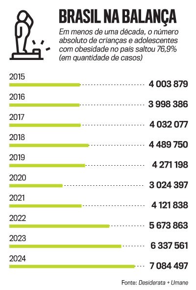 O planeta engorda em ritmo assustador — e de forma precoce. “Costumo dizer que é a doença da modernidade”, afirma o endocrinologista Bruno Geloneze, professor da Universidade Estadual de Campinas (Unicamp). A combinação entre a oferta de uma alimentação calórica e ultraprocessada e uma rotina sedentária tem sido terreno fértil para os pequenos engordarem. A biologia ajuda a explicar: nosso corpo, programado por milênios para sobreviver à escassez, hoje vive cercado de calorias baratas, altamente palatáveis e embaladas em pacotes coloridos — uma combinação que fisga especialmente os mais jovens. Estudos indicam que esse padrão alimentar favorece o desequilíbrio metabólico. “São produtos que enganam a área do cérebro responsável pela saciedade”, diz Geloneze. Come-se mais e gasta-se menos energia. O resultado se vê na balança ou na circunferência medida com fita métrica — que acusa o tipo mais perigoso de gordura corporal.